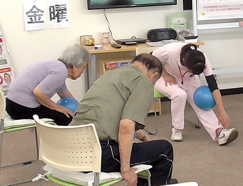 ボールを使用したストレッチ体操や、指の運度等、様々な運動を取り入れ、リハビリを行っております。